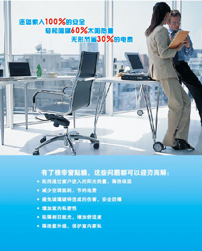 雅帝窗膜诞生以来,本着"专业、诚信、感恩",“与用户共谋发展”的企业宗旨,业务遍及全国市场,雅帝产品在建筑膜领域也家喻户晓,公司在做精做细建筑膜、安全膜、装饰膜、家居膜、软膜等常规系列产品的同时,目前又相继推出了行业内领先的冷隔热膜、恒色膜、紫外线全防护肤膜、防雾膜、等系列新产品,公司将紧紧围绕市场需求,敢想敢为,无私无畏,不断发展创新,做到尽善尽美,为用户提供更优质的产品和更完善的服务!......